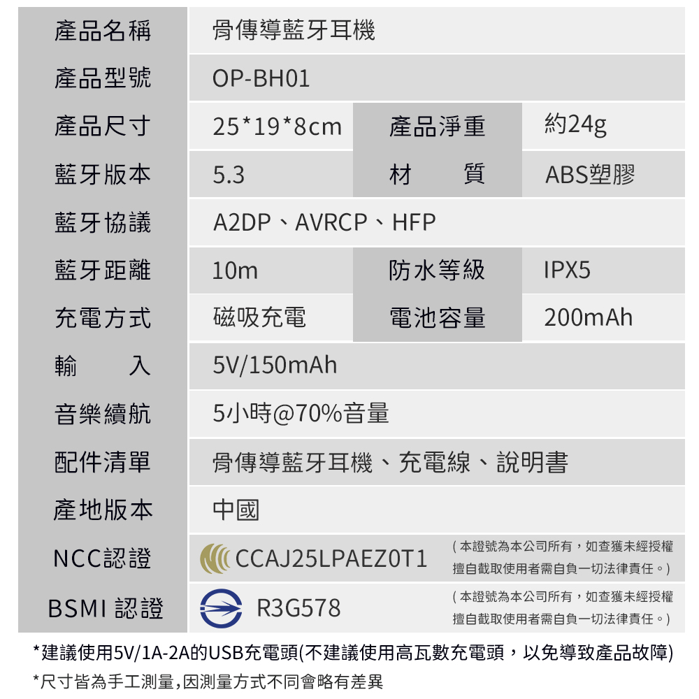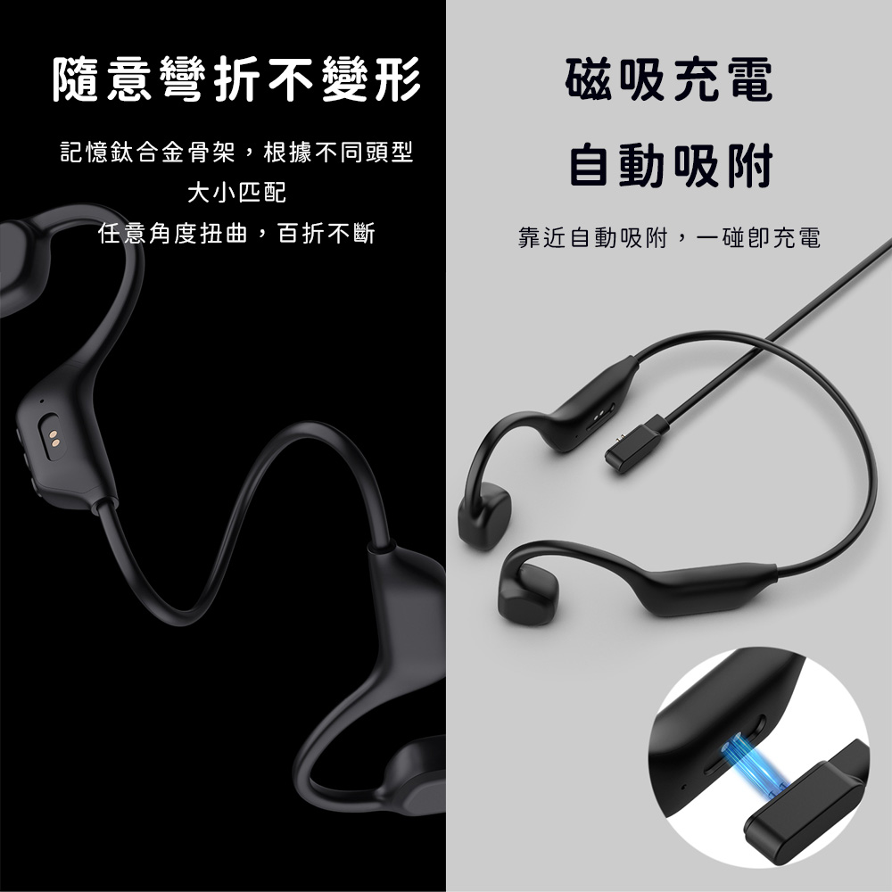 包裝內容:骨傳導藍牙耳機x1、磁吸充電線x1、說明書x1